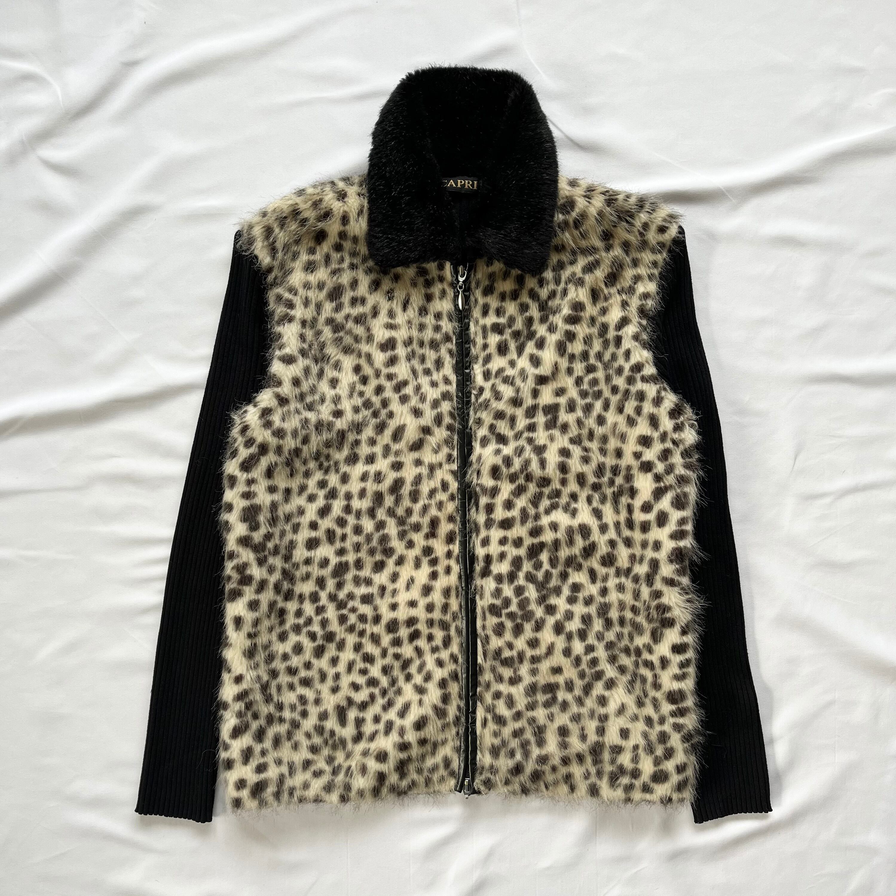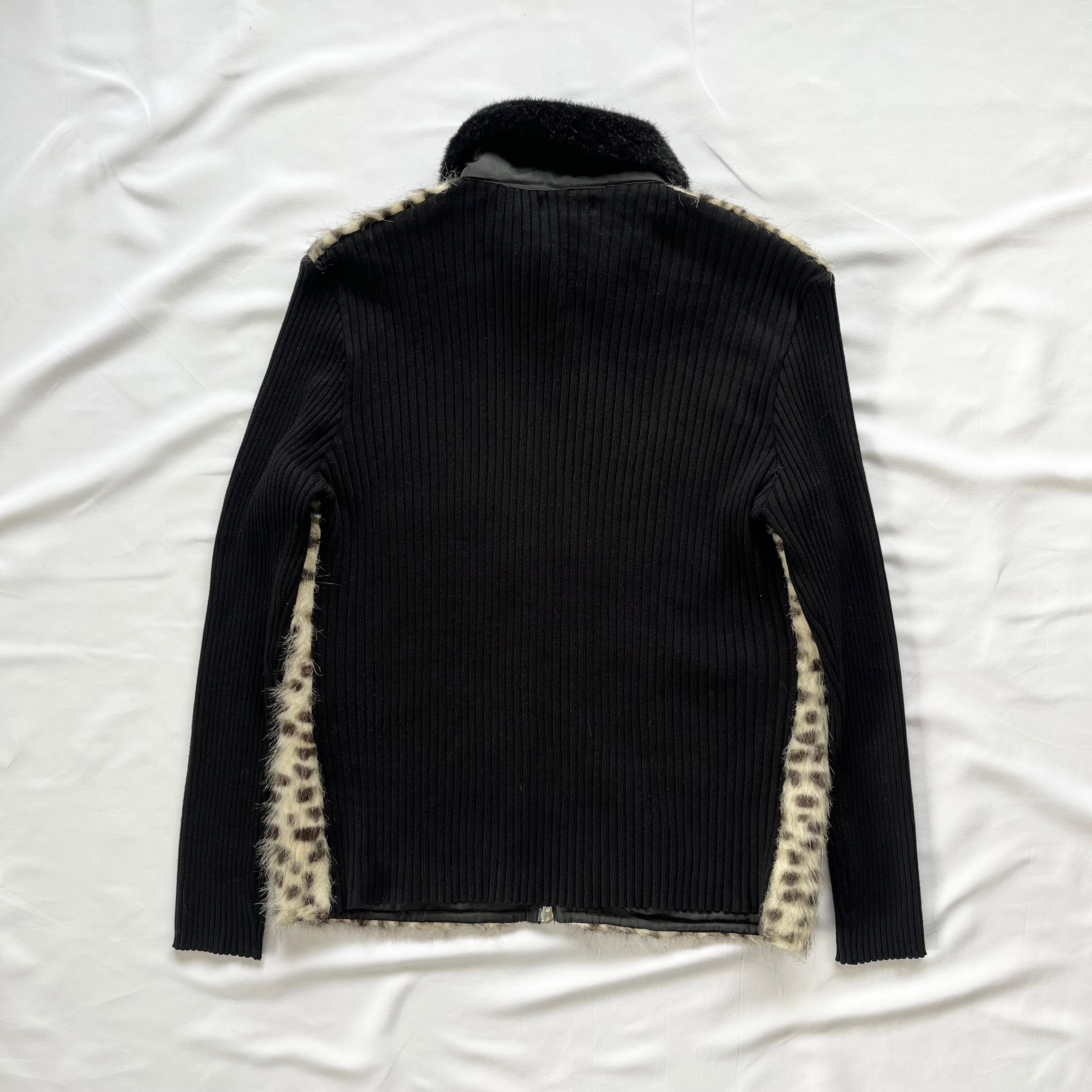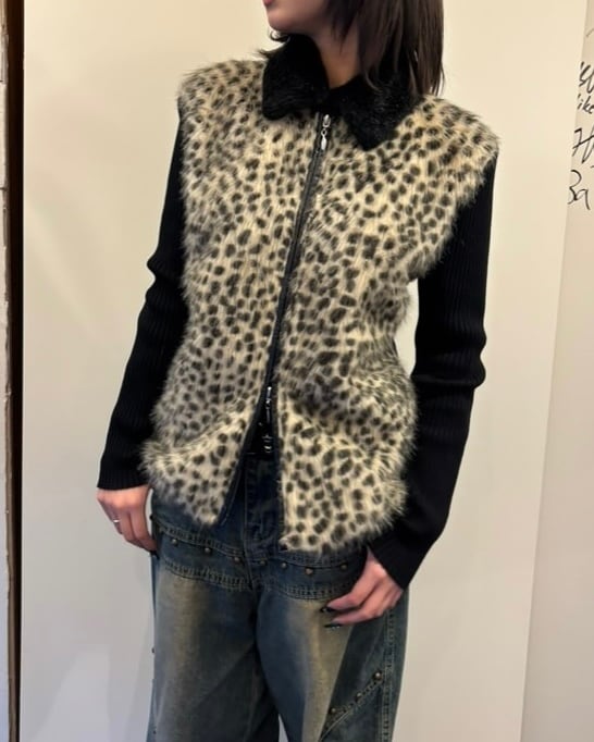 leopard×black faux fur zip-up sweater