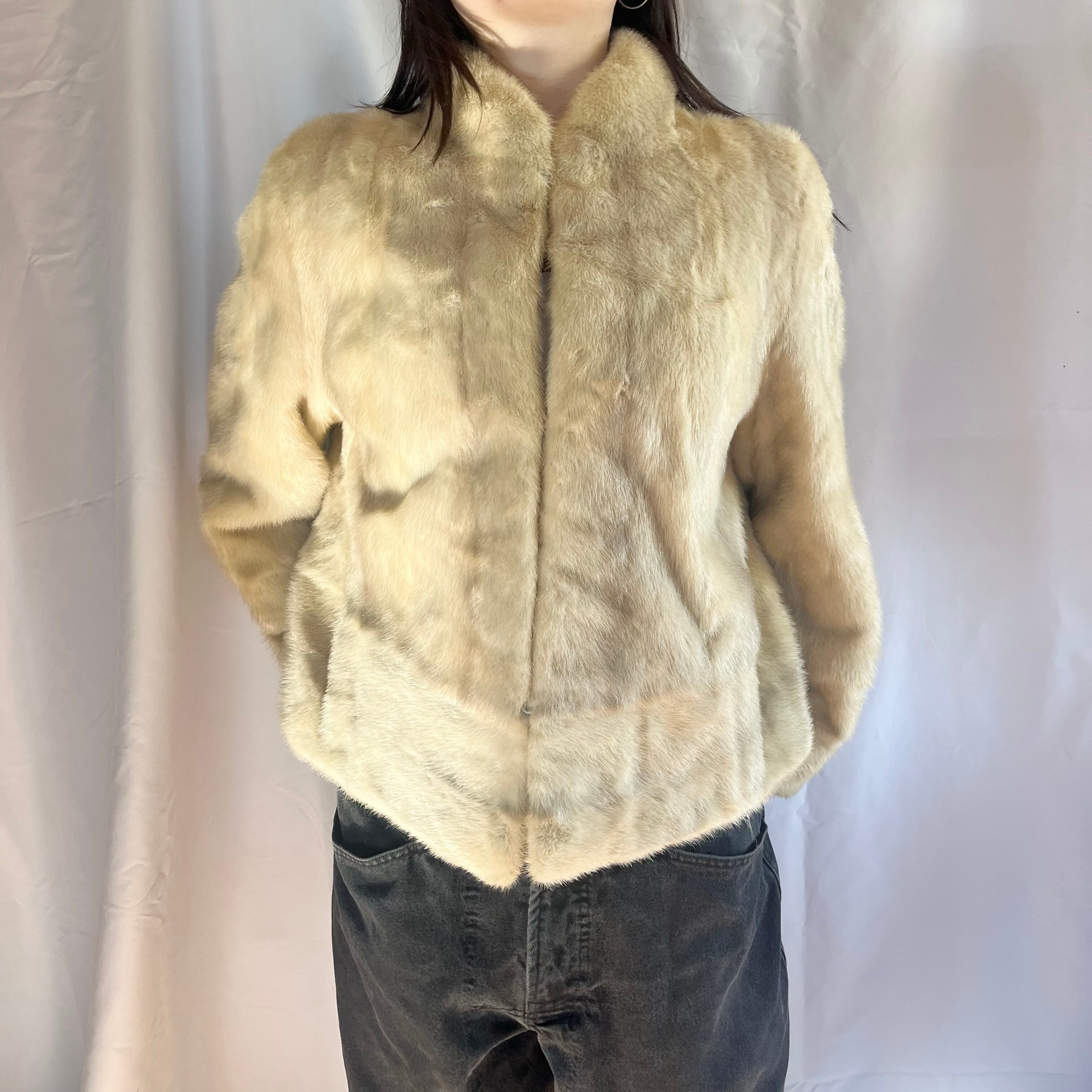 beige rabbit fur collarless coat